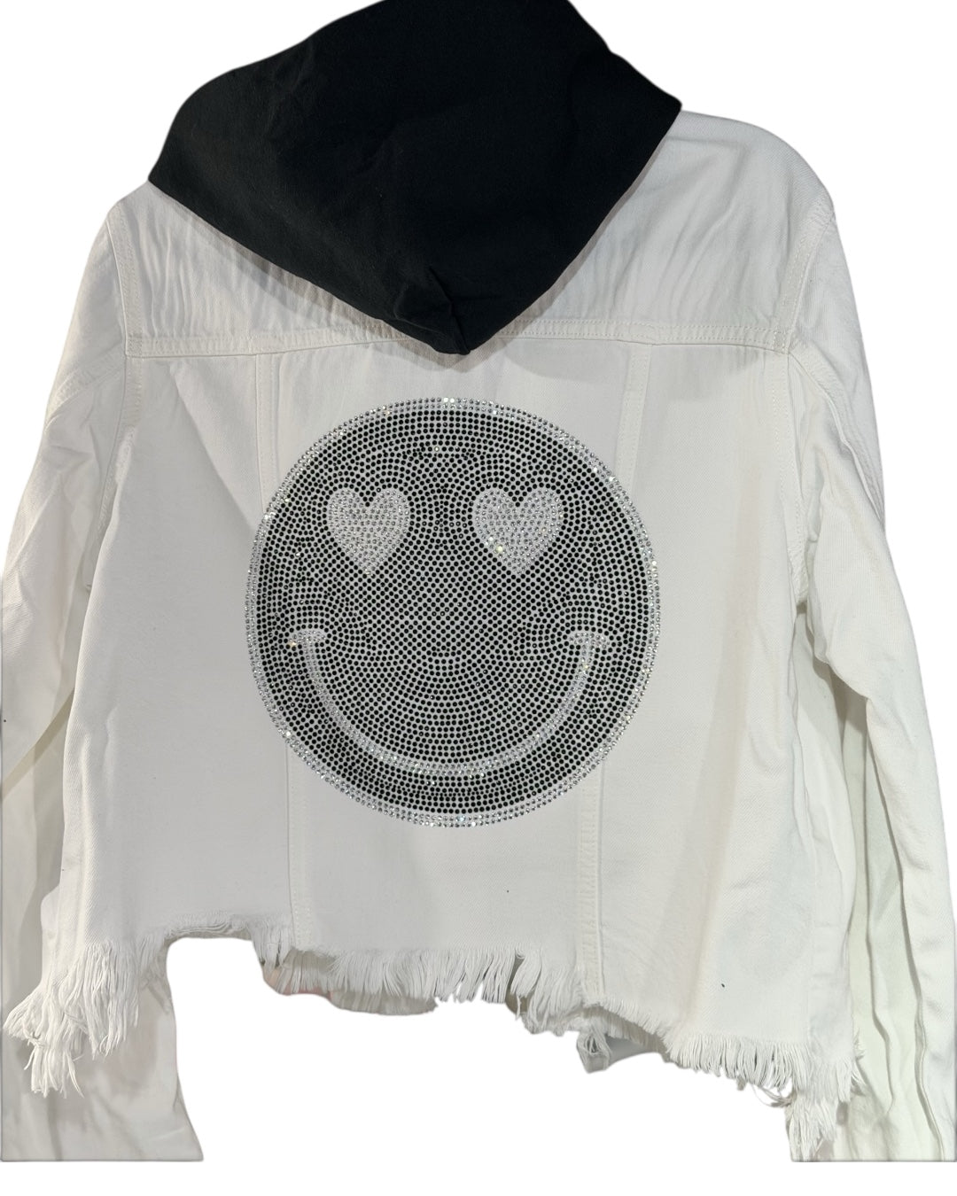 One of a kind jean jacket featuring an embellishment to make this jacket a true original