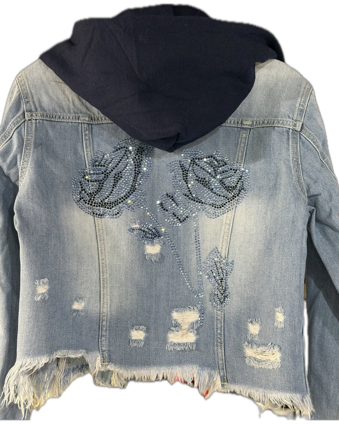 One of a kind jean jacket featuring an embellishment to make this jacket a true original